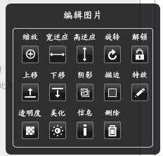 可对图片进行基于图片框的宽适应,高适应,上移,下移,可对图片进行旋转操作。对图片进行美化、阴影、描边、透明度、特效等操作,